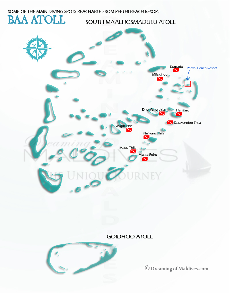 Locate Baa Atoll and Spot some of the best Diving Sites reachable from Reethi Beach resort