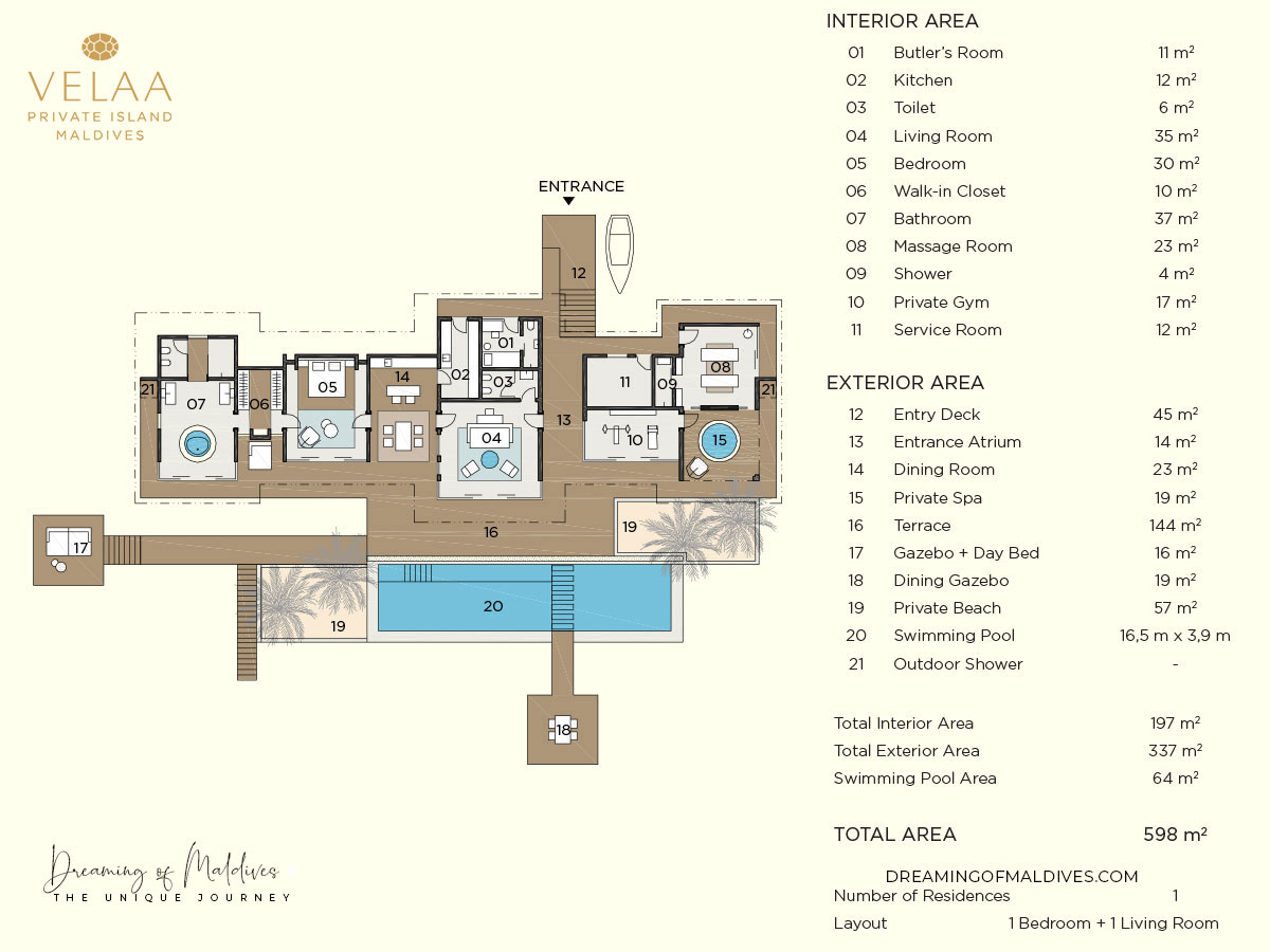 The Velaa Private Residence is Velaa most luxurious beach villa. The 1350 m2 beach Residence offers four bedrooms and can accommodate up to 10 travelers.