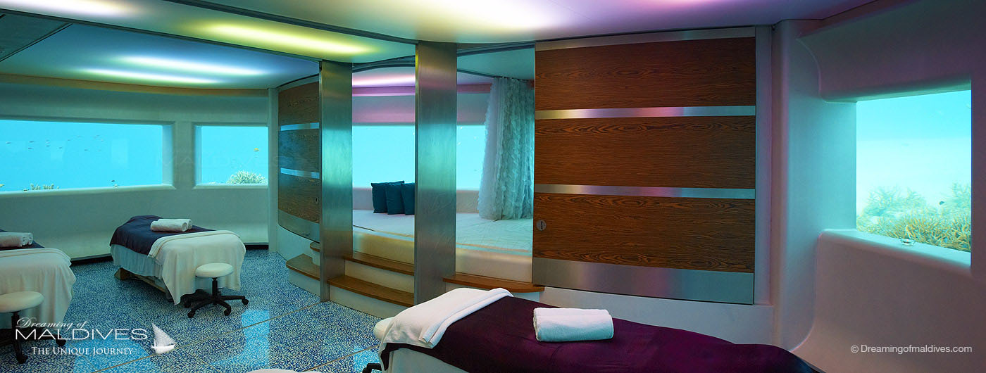 Véritable signature de l’hôtel, le spa sous-marin, appelé Spaquarium, se situe à près de 8 mètres de profondeur, au cœur d’un jardin de corail. Deux salles de soins sous-marines y sont installées, comme posées dans un gigantesque aquarium naturel où défilent une infinité d’espèces de poissons.