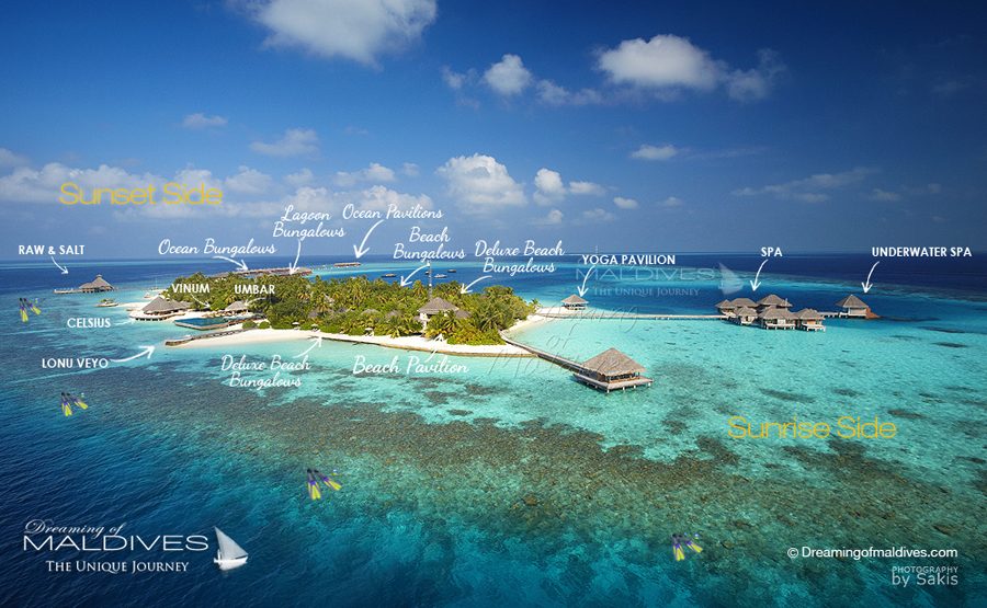 Le côté coucher de soleil accueille les villas sur pilotis orientées océan ainsi que les restaurants Raw & Salt. Du côté lever de soleil, nous trouvons le spa, la réception, la piscine, le bar Umbar et la cave à vins souterraine Vinum.