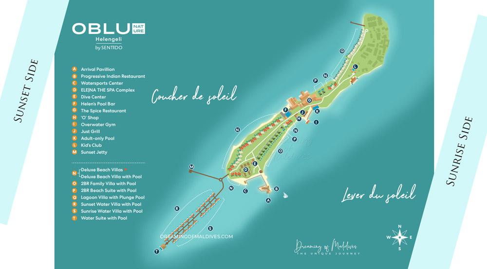 Cette carte de l’hôtel OBLU Helengeli vous montre une vue détaillée de l’île, les emplacements des villas et leurs orientations coucher et lever de soleil, les restaurants, les bars, les activités…