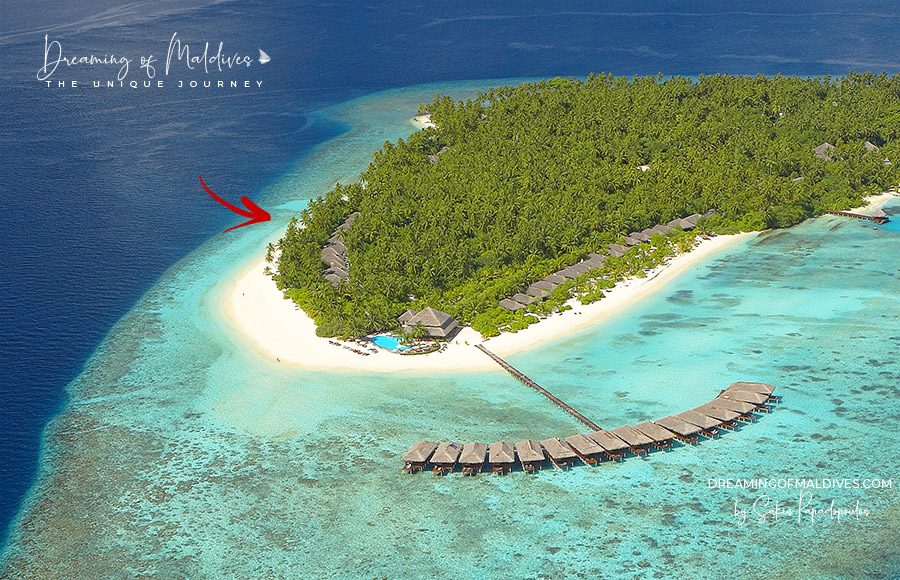 Les villas sur la plage de Filitheyo Island Resort, les Beach Bungalows, offrent toutes un excellent accès au snorkeling, Les villas indiquées avec la flèche rouge ont une plage moins large mais un accès direct sur les tombants extérieurs.