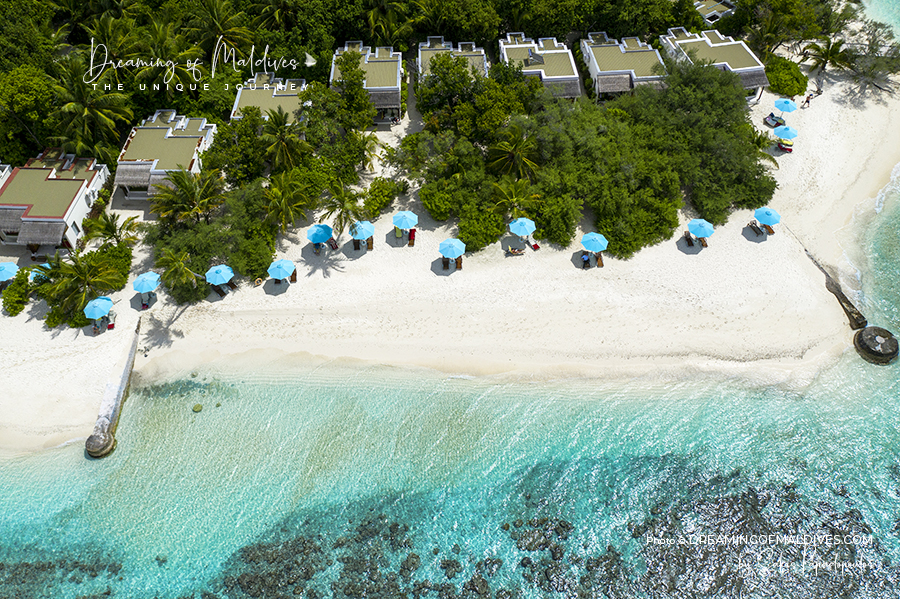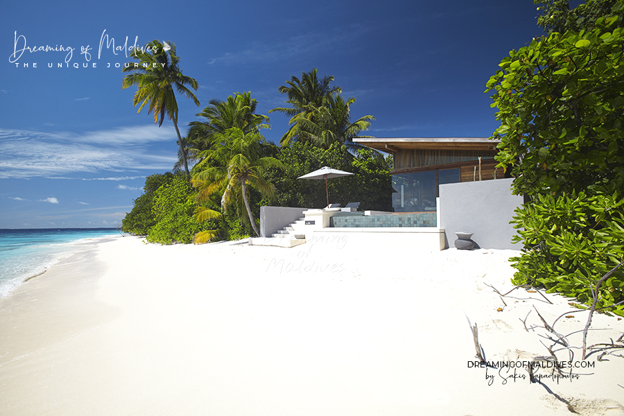 J’ai aussi beaucoup aimé les Villas sur la plage de Kandolhu appelées Pool Villas, dans laquelle nous avons d’ailleurs séjourné. Elles sont directement sur le sable mais sont un peu cachées par des haies de végétation suffisamment hautes pour avoir de l’intimité mais pas trop et juste assez pour laisser la vue sur le lagon.