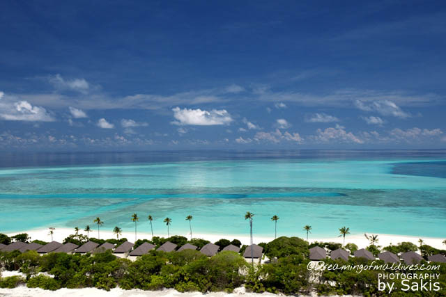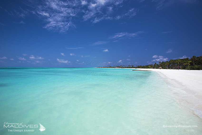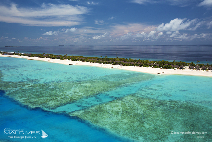 L’ile est posée entre océan et lagon avec d’un côté, un gigantesque lagon bleu infini et une très longue plage de 2 kms, et de l’autre des récifs coralliens avec vue sur l’océan bleu marine.