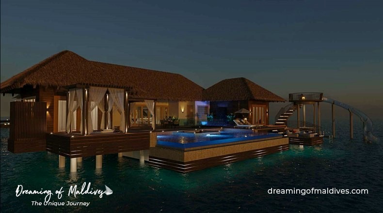 Les villas sur pilotis avec piscine disposent de toboggans individuels glissant directement dans la mer.