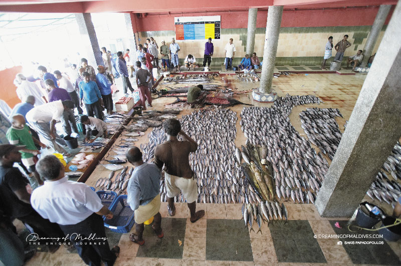 La pêche du jour — des centaines de thons et poissons de récif fraîchement pêchés — est soigneusement alignée au sol, sur les dalles du marché. Pêcheurs, marchands et habitants se pressent autour des étals, inspectant les prises, discutant les prix, échangeant des histoires. Une scène quotidienne, simple mais essentielle, au cœur de la culture maldivienne.