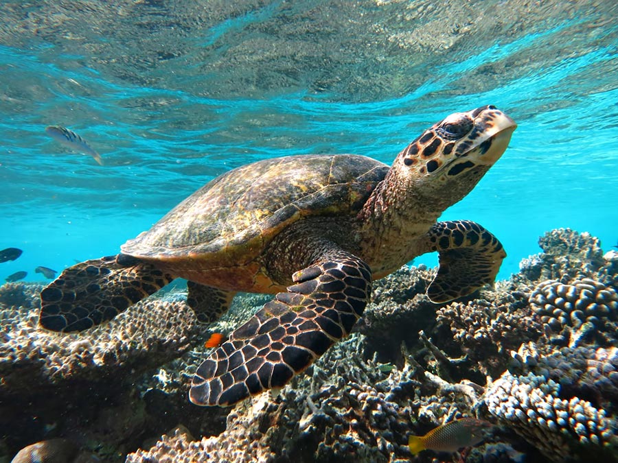 Entrez dans le lagon et vous pourrez rapidement nager avec une tortue ! Continuez plus loin (selon votre niveau) et vous rencontrerez encore plus d’espèces marines sur de magnifiques tombants.