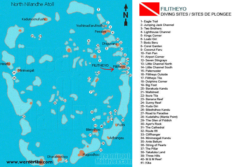 Cartes de tous les sites de plongée de l’Atoll de Faafu accessibles depuis Filitheyo + une carte des Maldives pour vous repérer et localiser l’Hôtel.