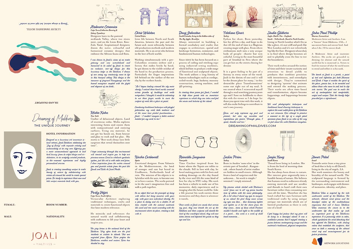 Les oeuvres d’art et installations ont été créées exclusivement pour Joali par différents artistes inspirés par la nature de l’île : Misha Kahn, Nacho Carbonell, Porky Hefer, Studio Glithero, Zemer Peled, Chris Wolston, Doug Johnston et Ardmore, basés à Londres.