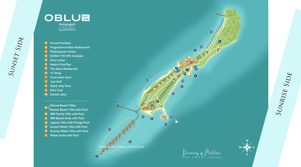 This map of OBLU Helengeli Maldives shows you a detailed view at the resort with the locations of the villas and their numbers, the snorkeling, sunset and sunrise sides, the restaurants, bars, the activities…