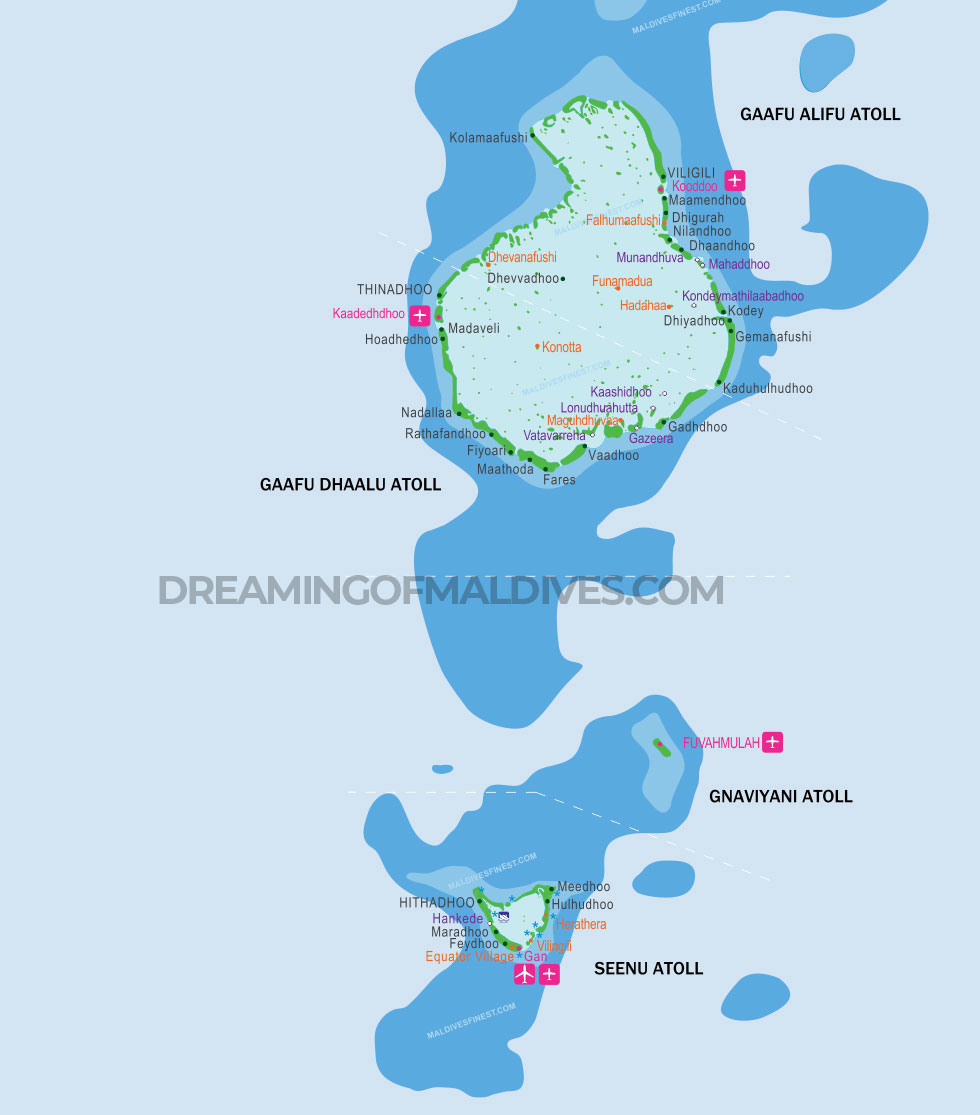 Explore this new Maldives Map with all Maldives Airports, important local Islands, various essential Maldives points of interests and of course to locate your favorite resort on the Map !