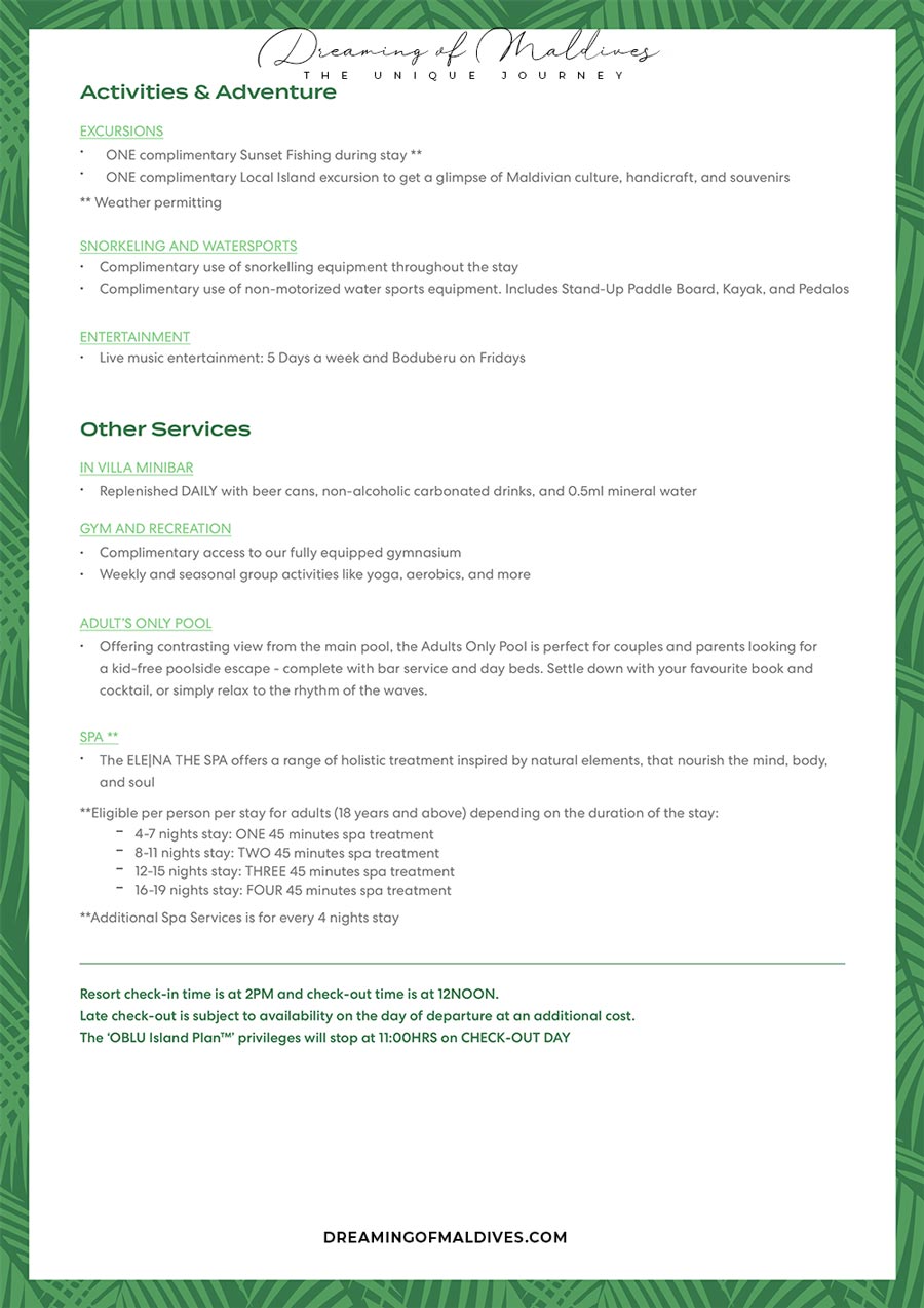 - ONE complimentary Local Island excursion to get a glimpse of Maldivian culture, handicraft, and souvenirs.