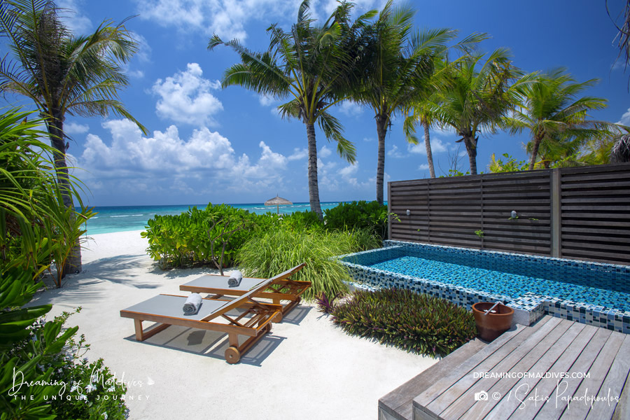 Located on the northern beach of Sangeli, the 14 Deluxe Beach Pool Villas are identical to the Beach Villas and benefit from a small swimming pool with lagoon views on their deck.