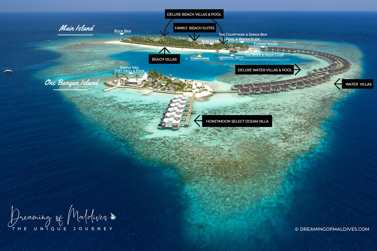 A stone’s throw away in the lagoon is another islet called One Banyan Island. Partly reclaimed from the sea, this island is reserved for couples and houses a restaurant, a swimming pool reserved for adults only ( open for teens above 16 years old ), the resort spa and the highest villa categories, the beautiful Honeymoon Select Ocean Villas located overwater.