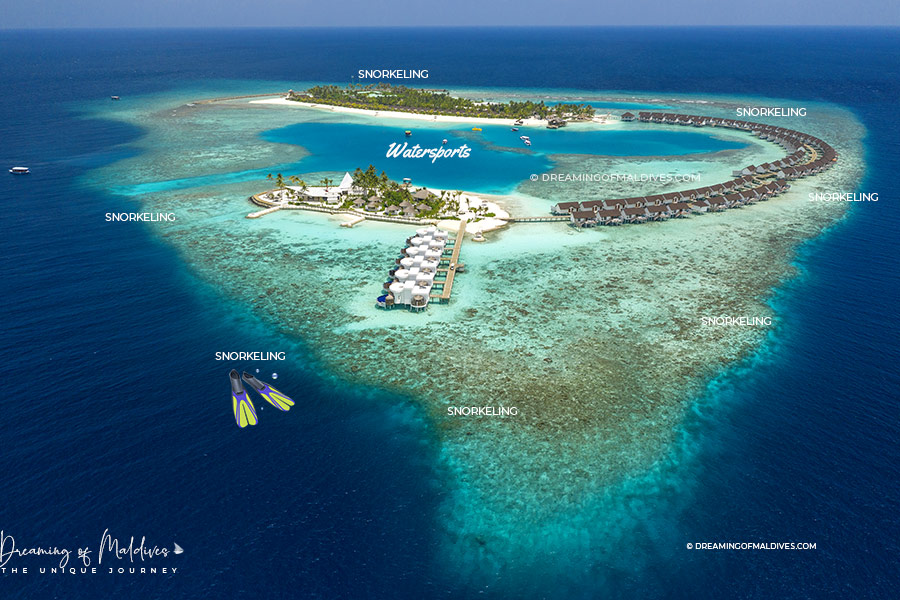 I classify Sangeli in the type 3 category for snorkeling, my favorite, the one with the dreamy DUO : a good snorkeling on one side and a large lagoon for sailing on the other. The best you can get in Maldives.