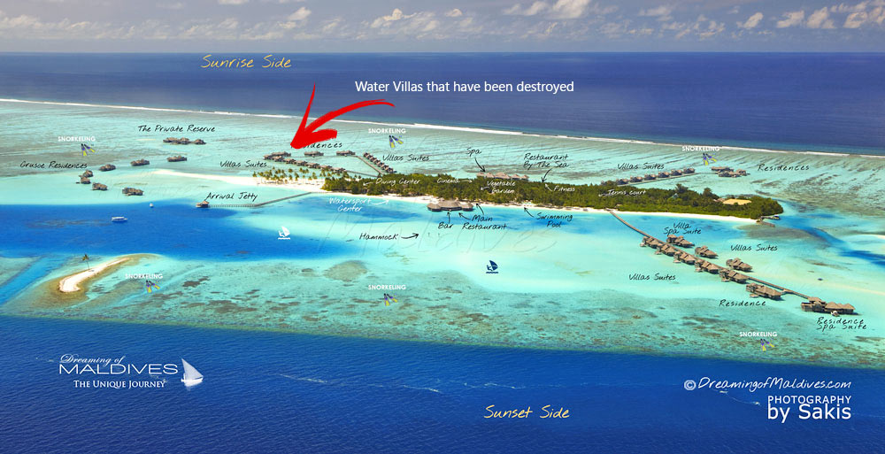First local reports announce that at least 7 Water Villas were destroyed.