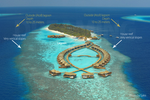 The island is located on a very narrow reef with nice slopes and big walls, reachable directly from the beach and the Water-Villas.