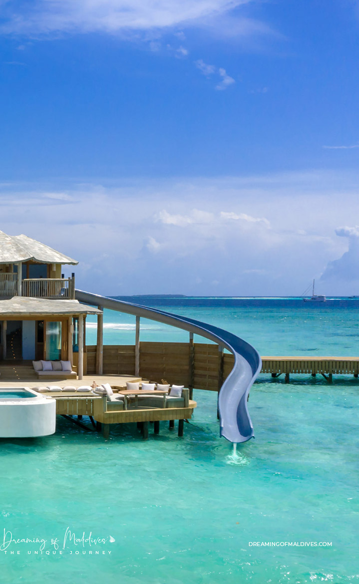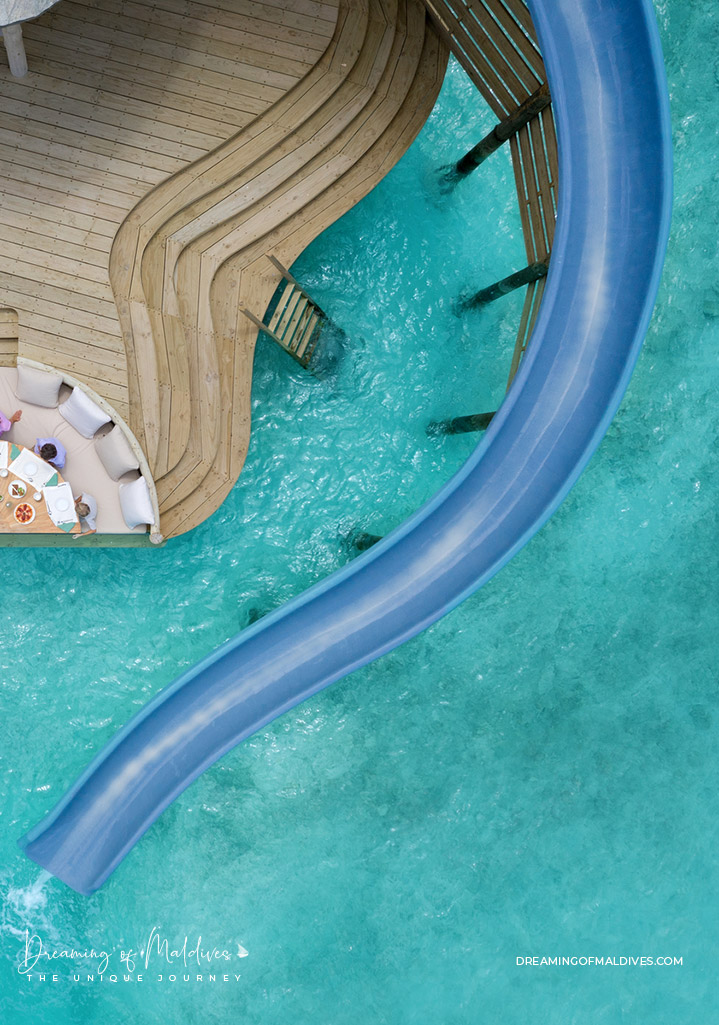 Soneva Fushi had already has the largest amount of water slides in Maldives with a gigantic water slide inside the resort Kids Club, at the resort overwater restaurant Out-Of-The-Blue and in most of its Beach Villas.