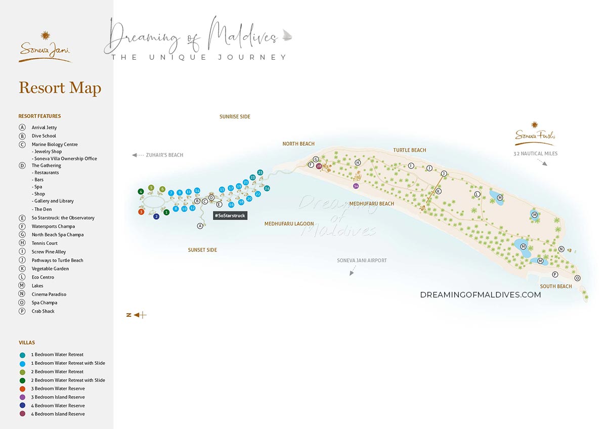 This map of Soneva Jani shows you a detailed view at the resort with the locations of the villas and their numbers, the snorkeling channels, restaurants, bars, the activities…