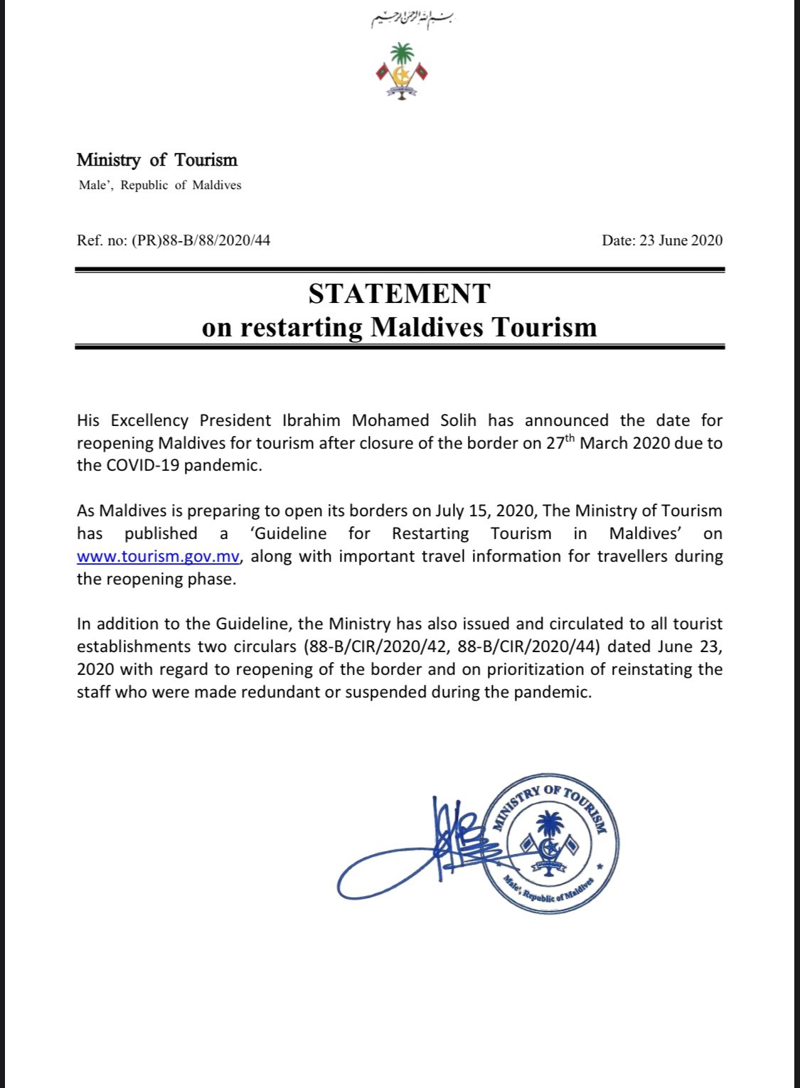 Resorts, Liveaboards and hotels located at uninhabited islands will be open for tourists from July 15, 2020 and not July 01st as initially scheduled.